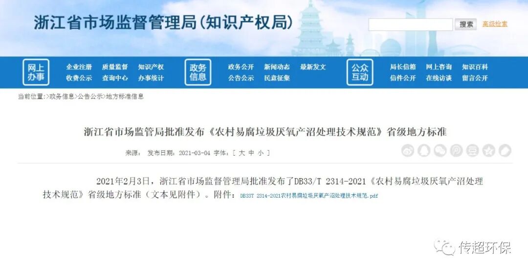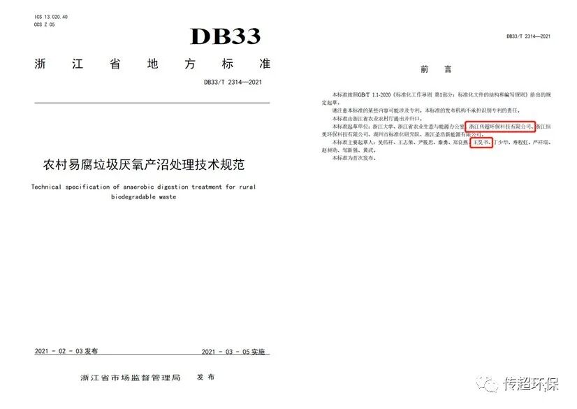喜讯|浙江大学联合传超环保等单位主编《农村易腐垃圾厌氧产沼处理技术规范》正式实施